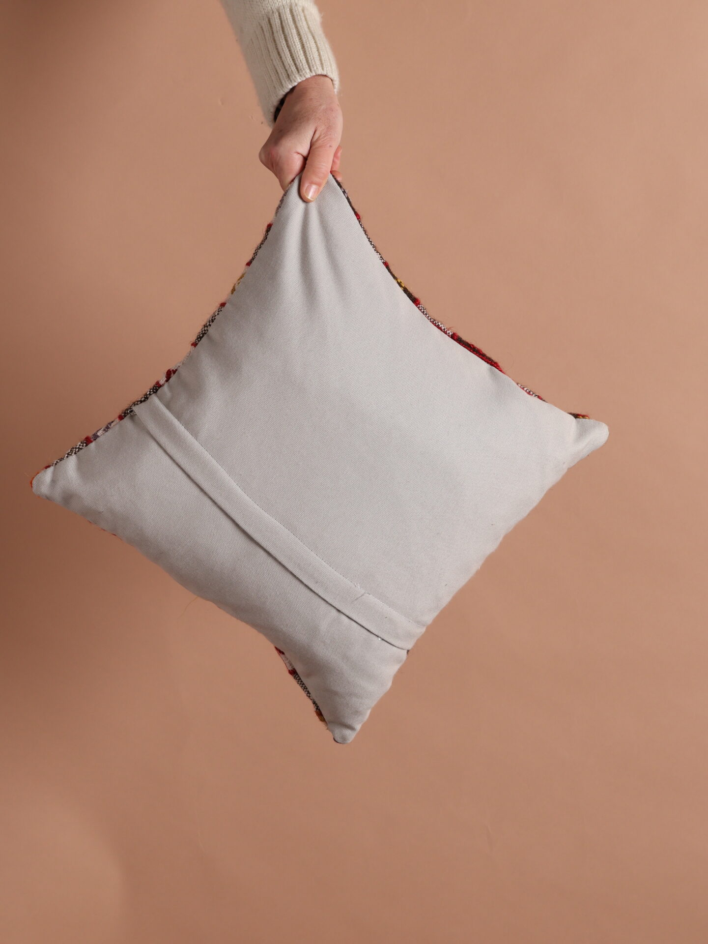 Hand woven wool kilim cushion cover with contrast cotton back and removable zip closure.