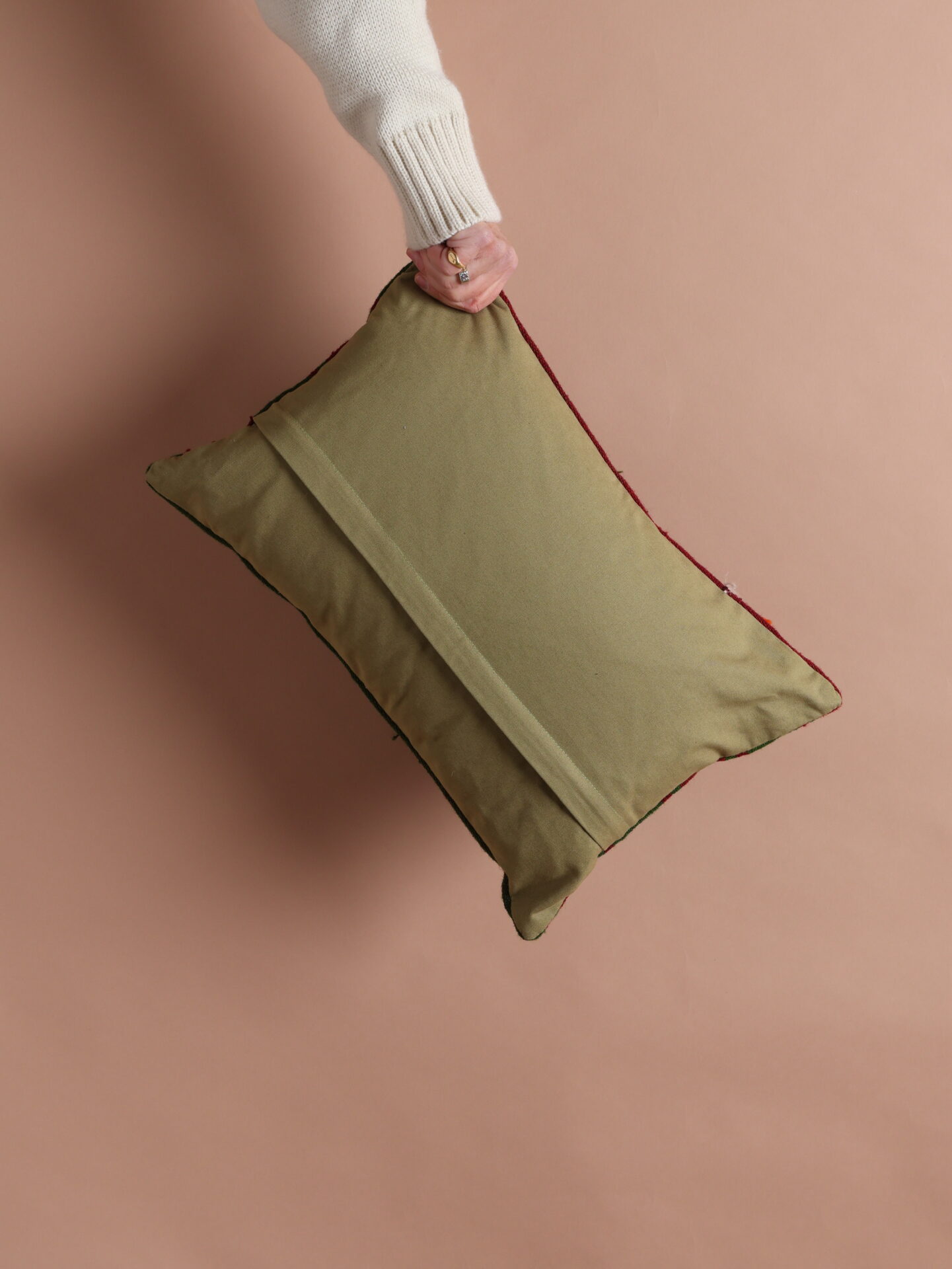 Hand woven wool kilim cushion cover with contrast cotton back and removable zip closure.
