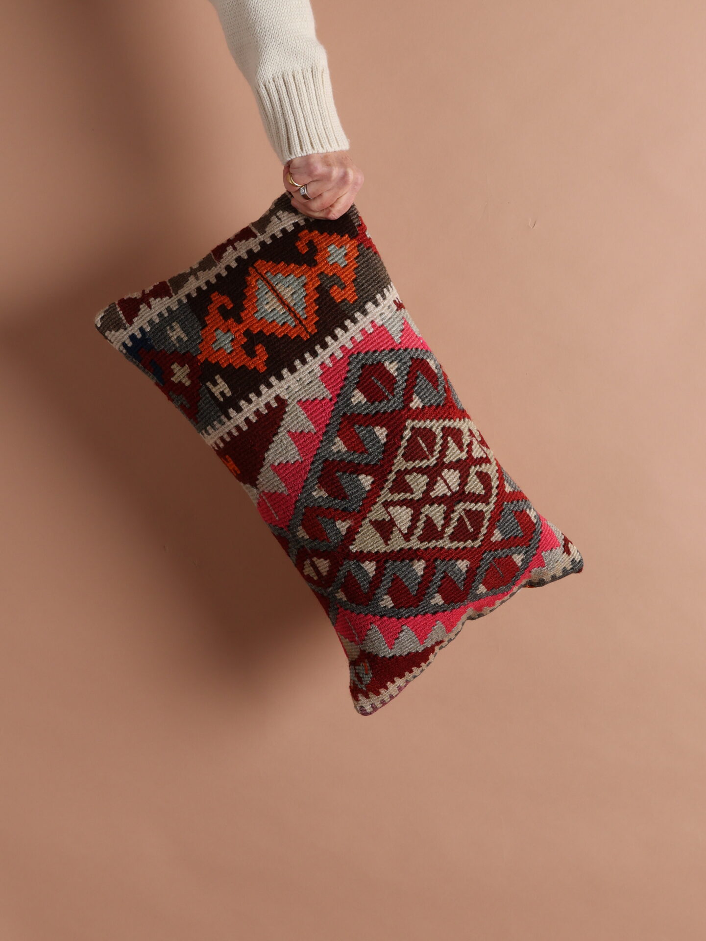 Hand woven wool kilim cushion cover with contrast cotton back and removable zip closure.