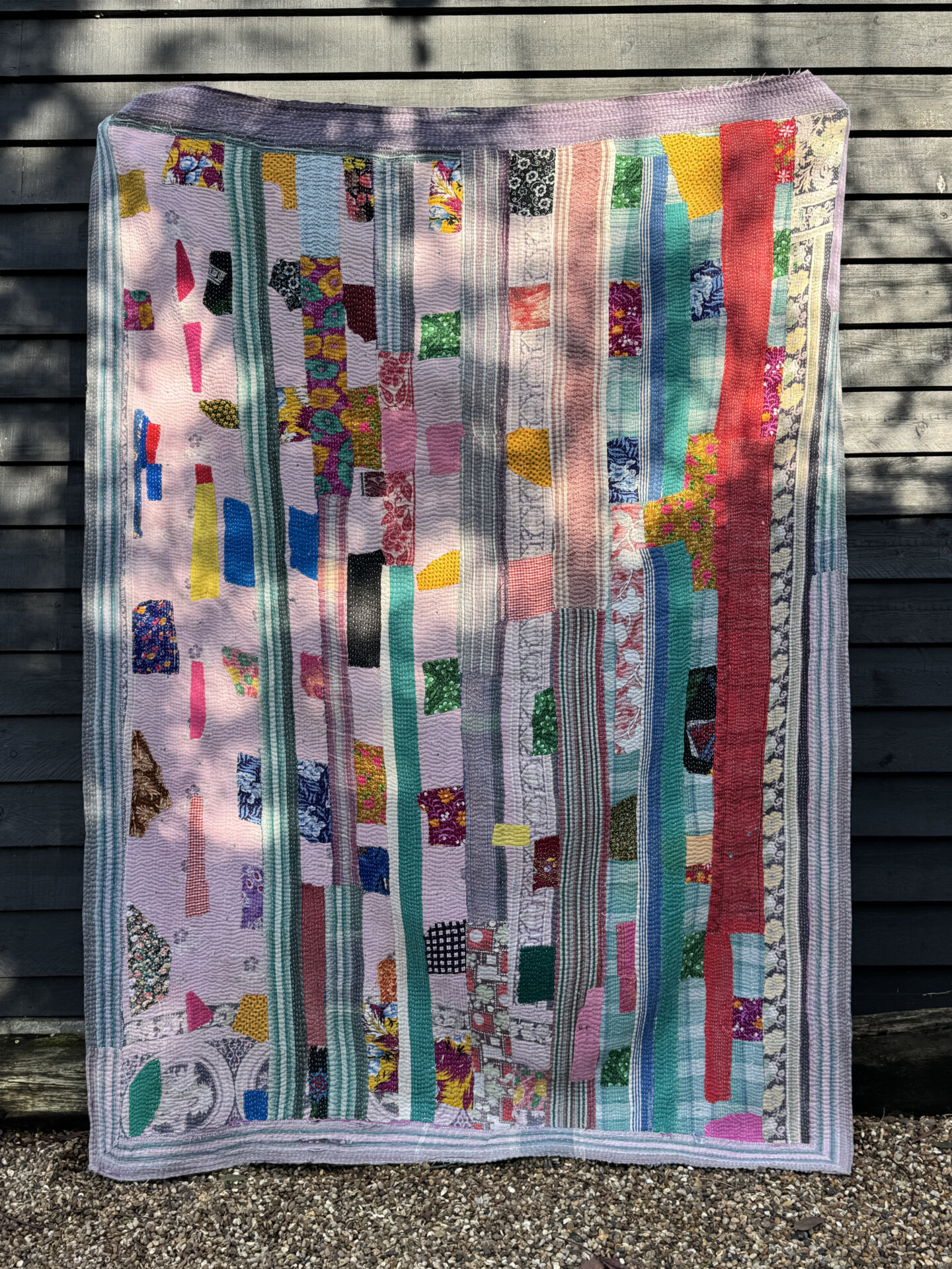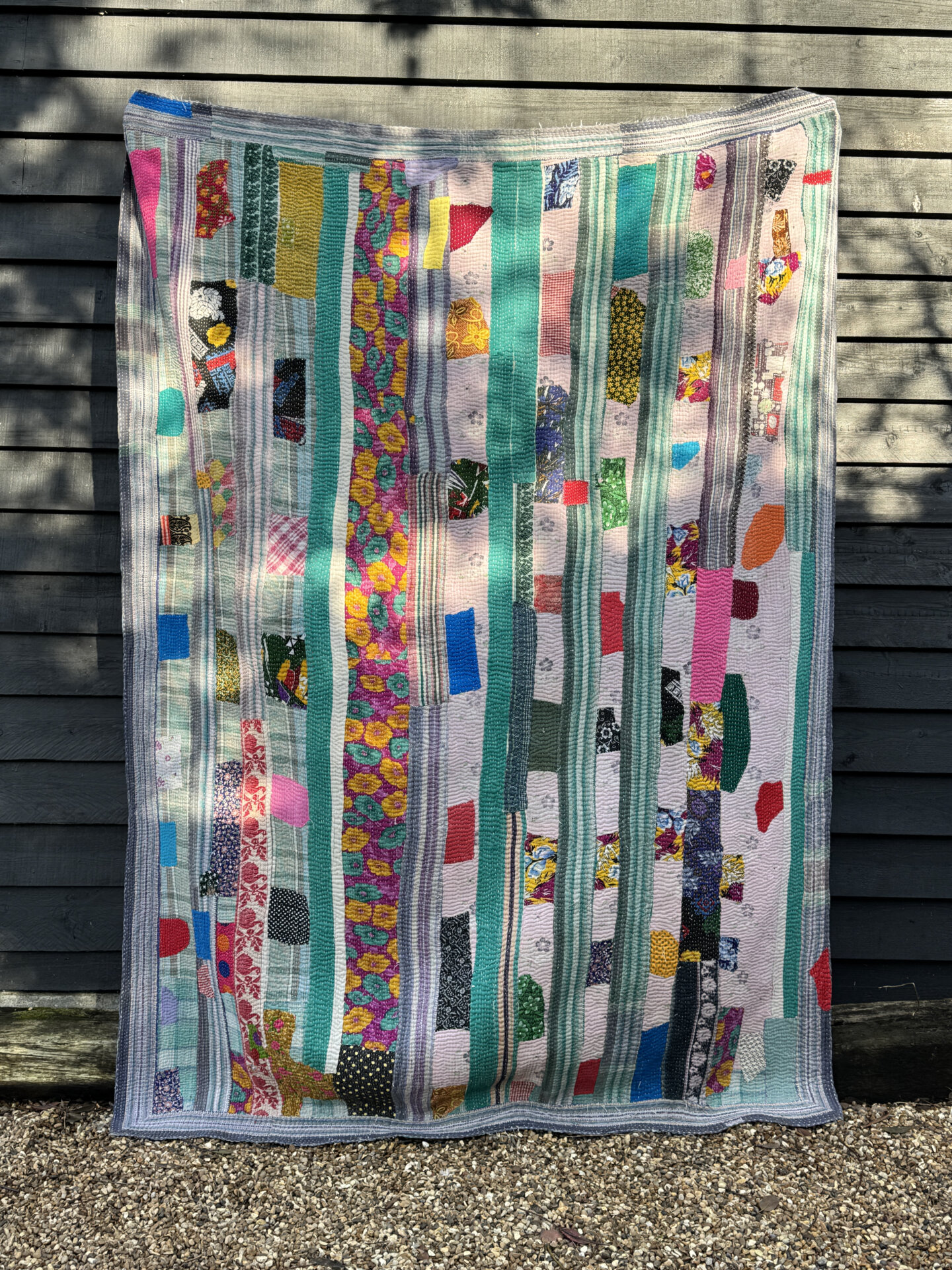 This beautiful piece of art has been made by hand using old patchworks of Indian cotton saree materials. A generous layer of fabrics are quilted together to give the Kantha blanket its warming weight and durability. You will find as the fabrics on the outer layer start to deteriorate over years of use, the beautiful shades and colours of the fabrics underneath will hint through making it look even more astonishing as it ages.
